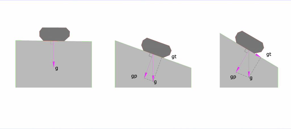 The perpendicular component of gravity (gp), helps to hold the object in place on the slope. The tangential component of gravity (gt), causes a shear stress parallel to the slope that pulls the object in the down-slope direction parallel to the slope. Steeper the slope, more tangential component of gravity (gt) and lesser will be the perpendicular component of gravity (gp) effect, which in turn increase shear stress and hence movement of overlying mass.
